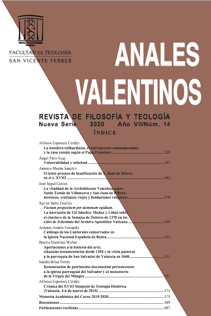 Ángel Peris Suay, «Vulnerabilidad y solicitud», Revista de Filosofía y Teología. Nueva Serie 2020, Año VII/Núm. 14, pp. 347-362 RESUMEN En este texto se analiza la experiencia del sufrimiento como un rasgo característico de la vulnerabilidad humana. Se muestra el sufrimiento como un sentimiento que está más allá del dolor y que se debe entender desde un doble eje: la […]